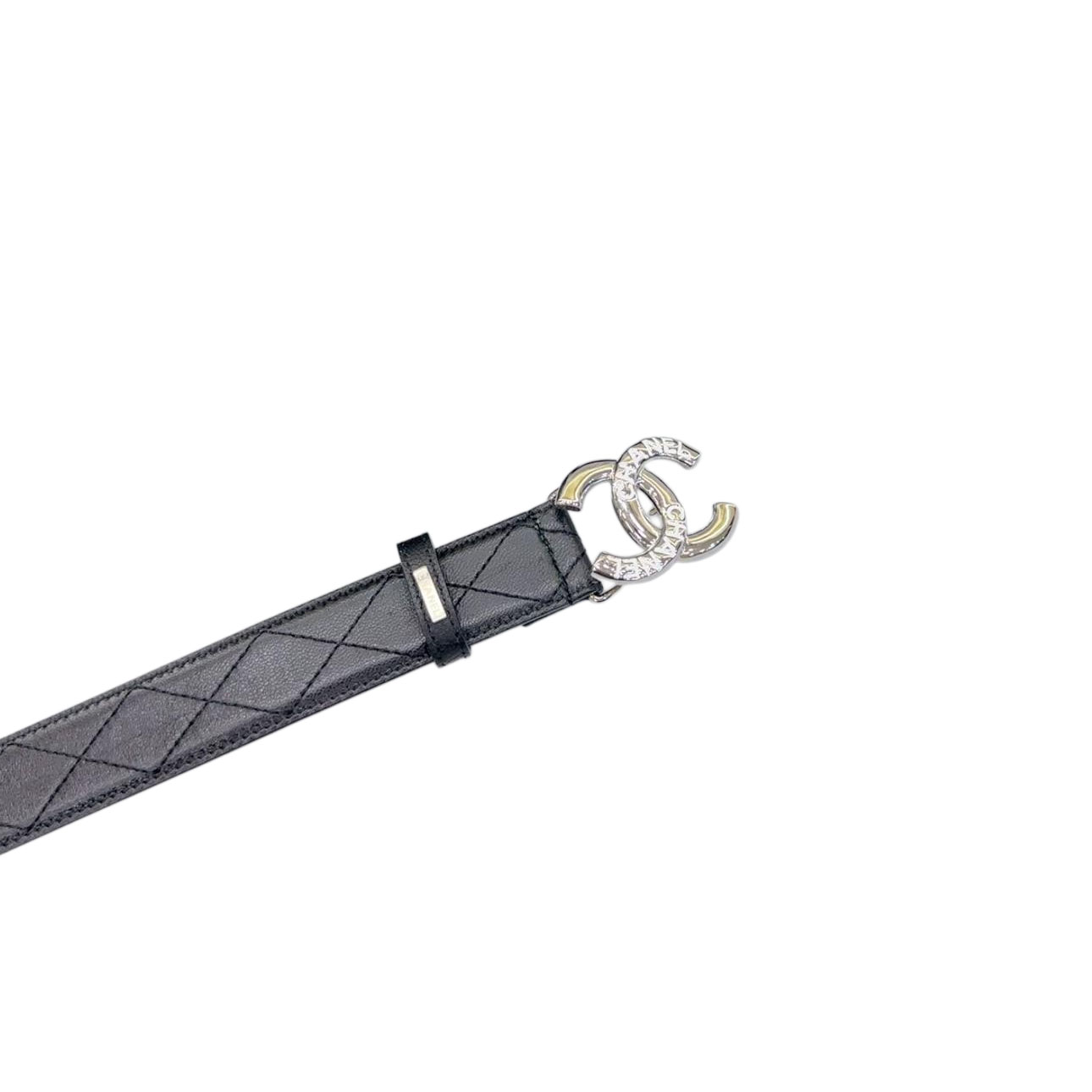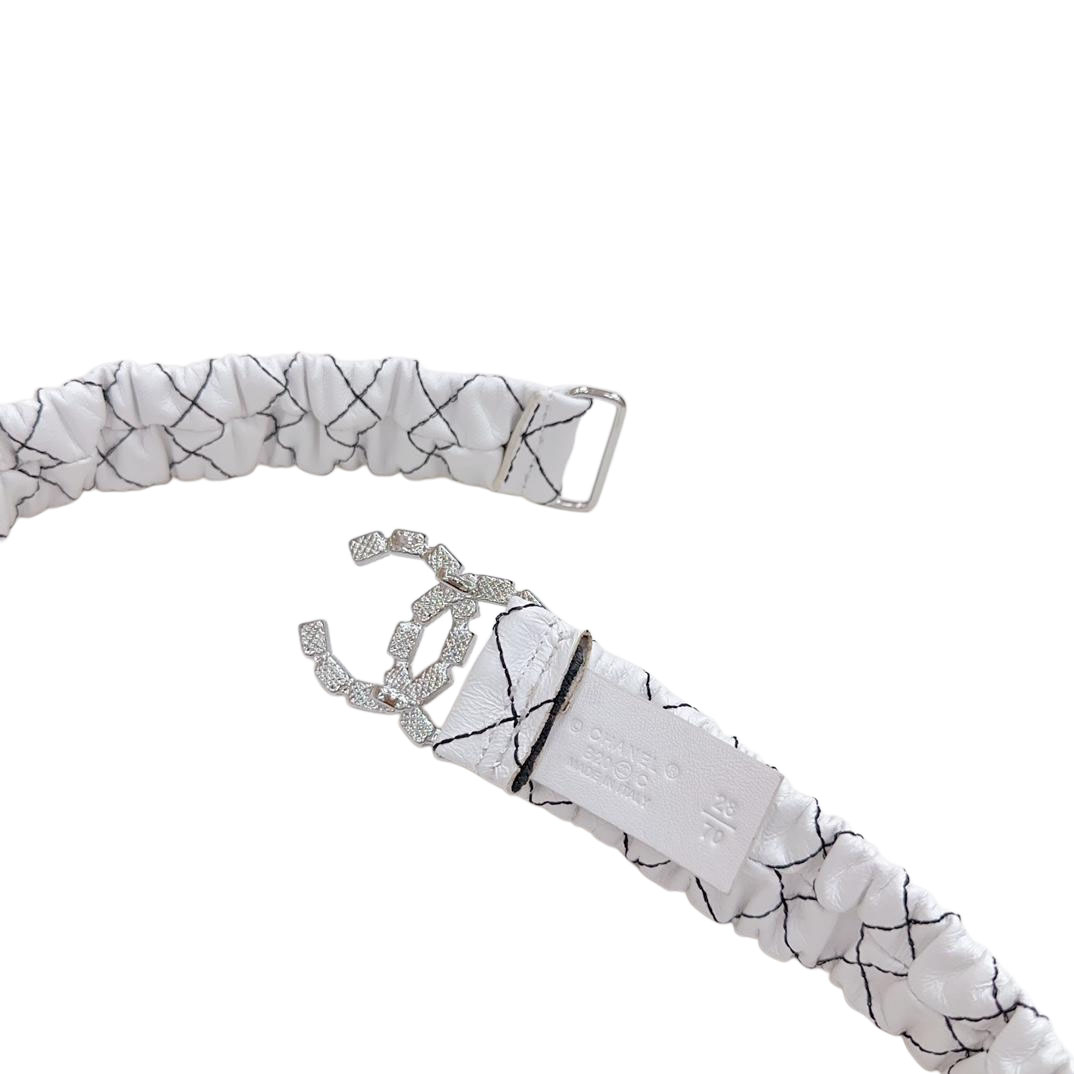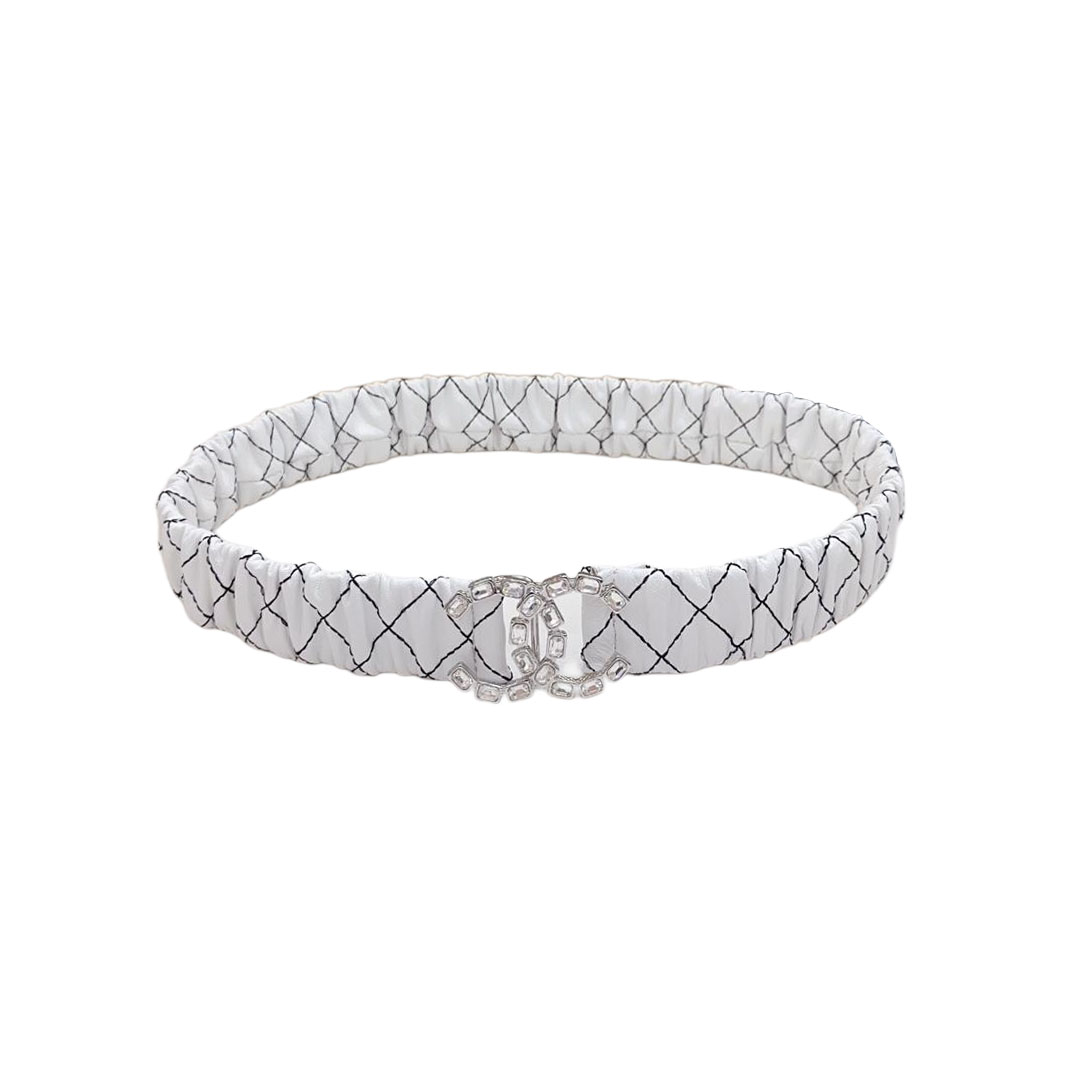 Chanel Women's CC Crystal Buckle Elastic Belt In Black/White Diamond Stitching Calfskin With Silver Hardware 30mm