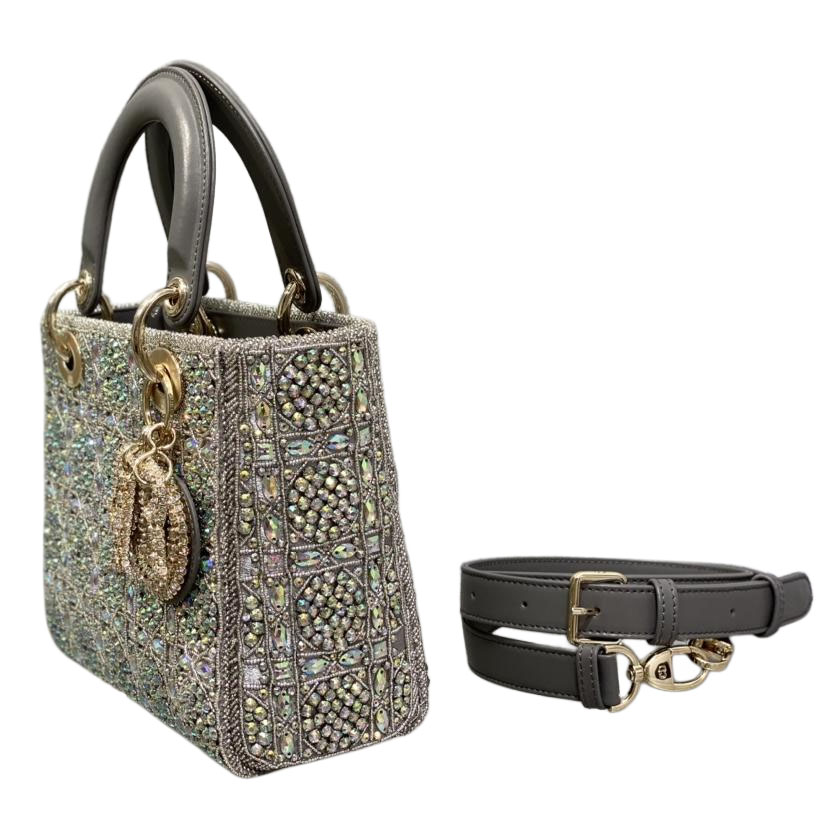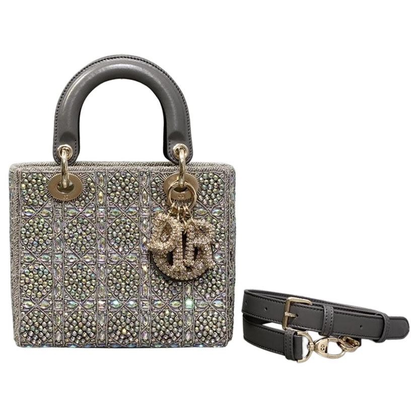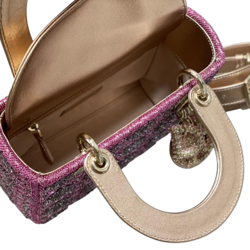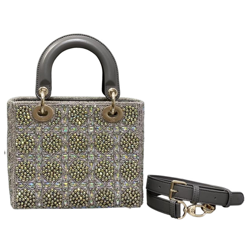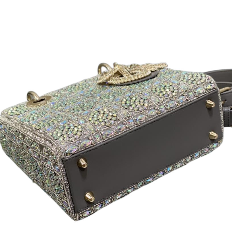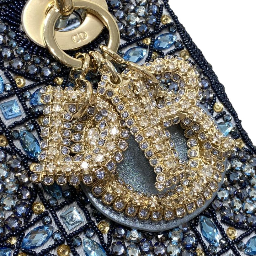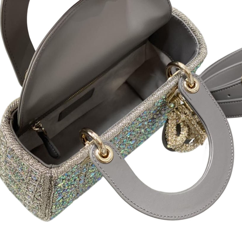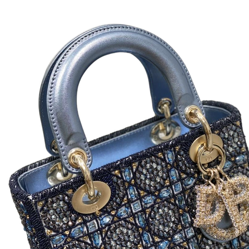 Dior Small Lady Dior Bag Metallic/Blue/Grey Lambskin and Rose des Vents/Dark Blue/Light Grey Satin Embroidered with Beads Gold Hardware