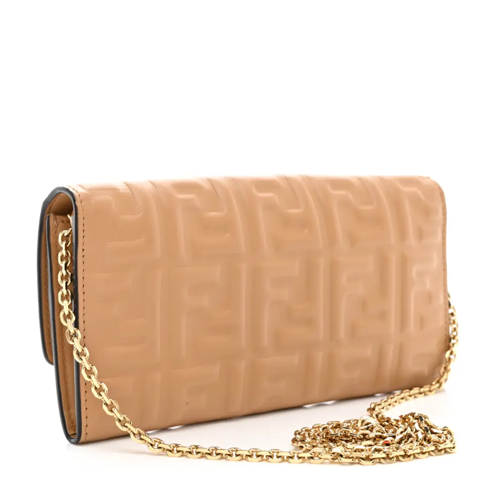Fendi FF Embossed Continental Wallet On Chain (WOC) Matisse Nappa Leather Miele Scuro Gold Hardware