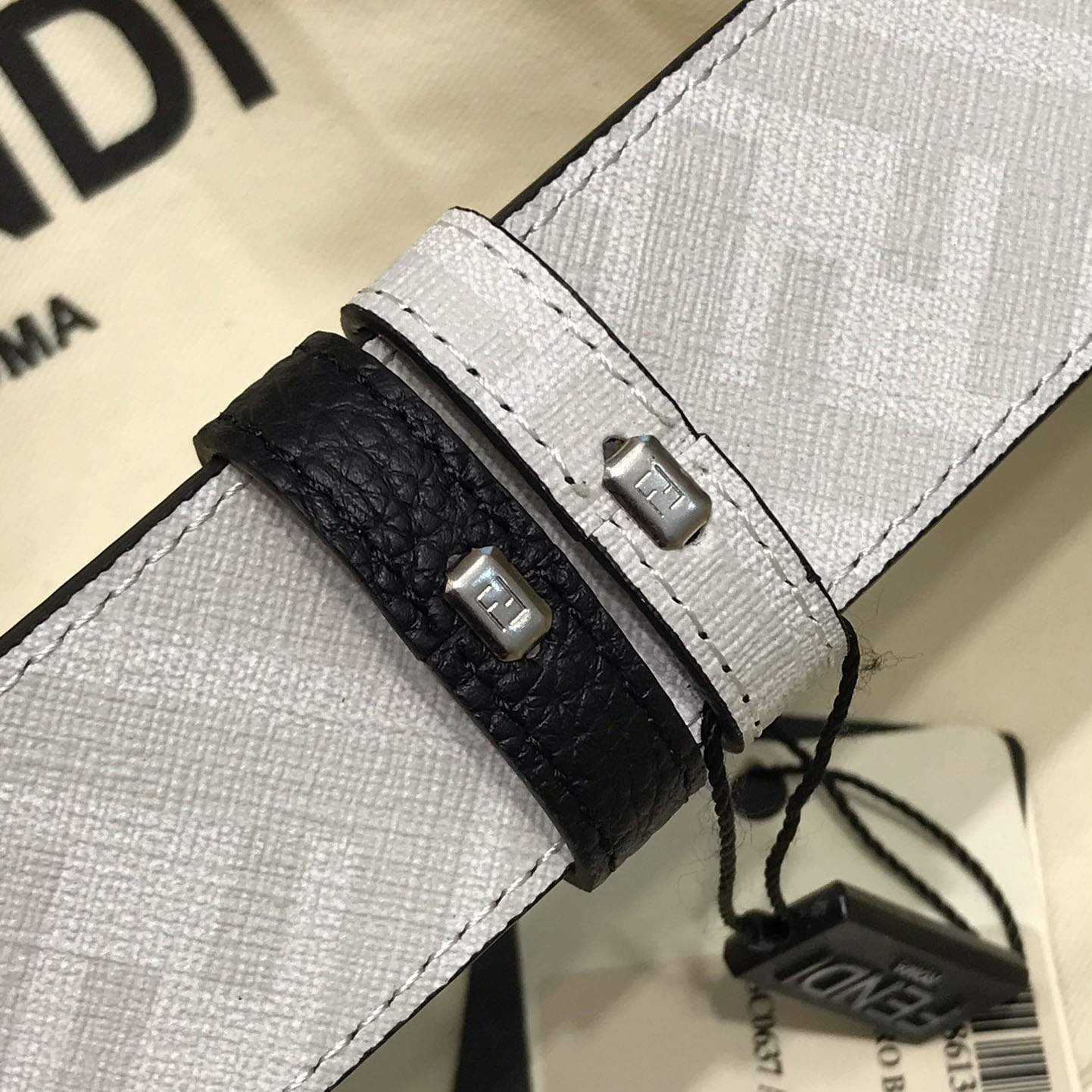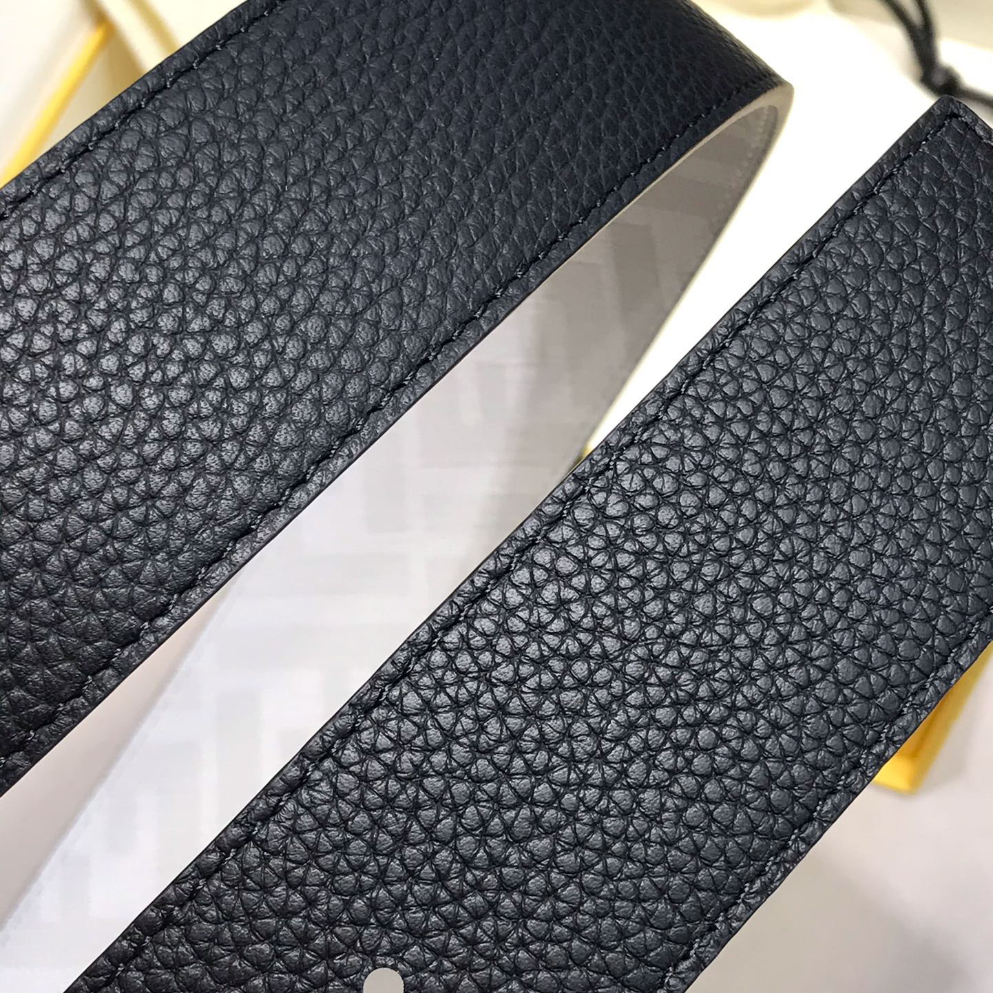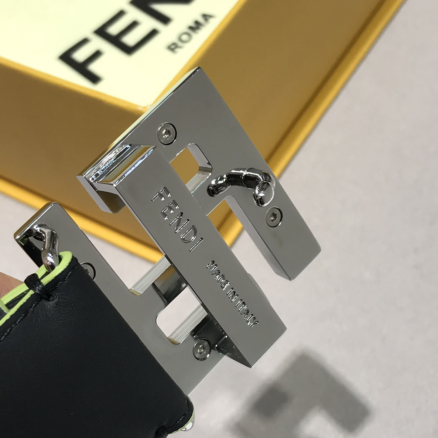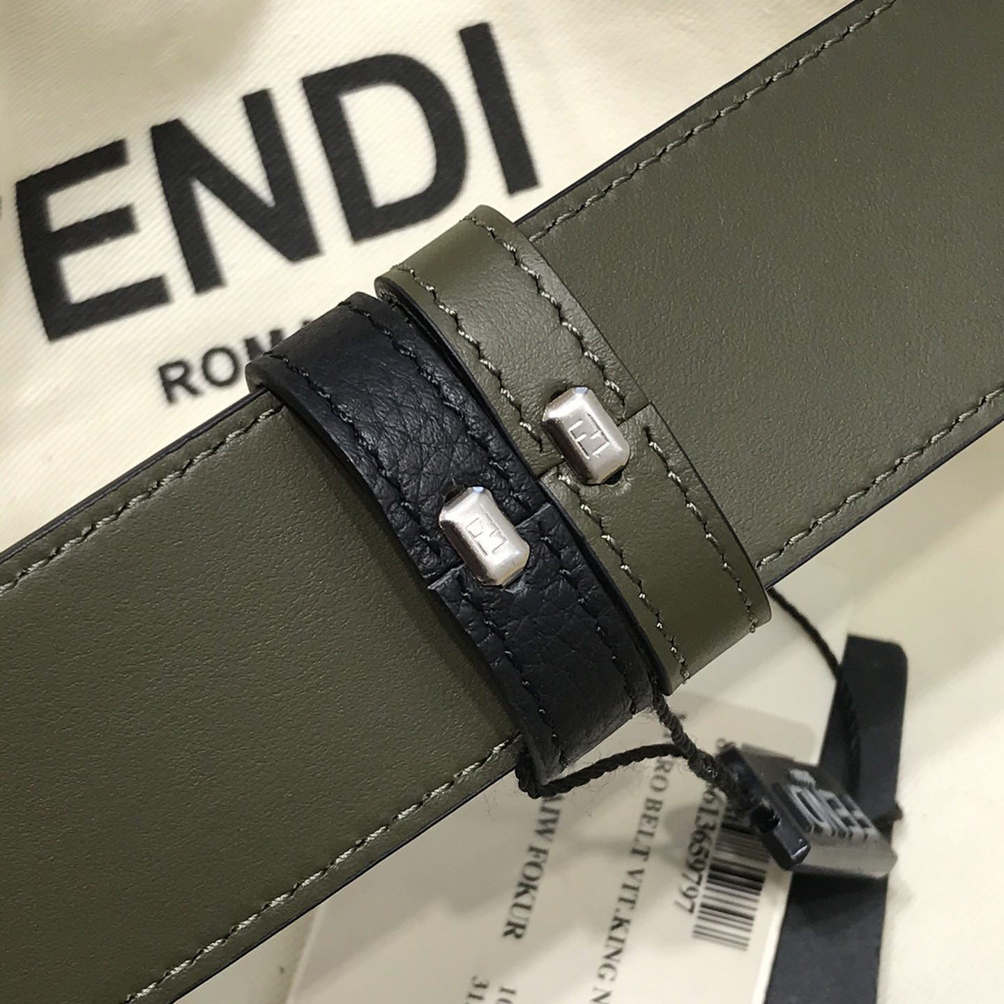 Fendi Men's Square Buckle Belt In Black/Olive Litchi Grain Calfskin With Silver Hardware 38mm
