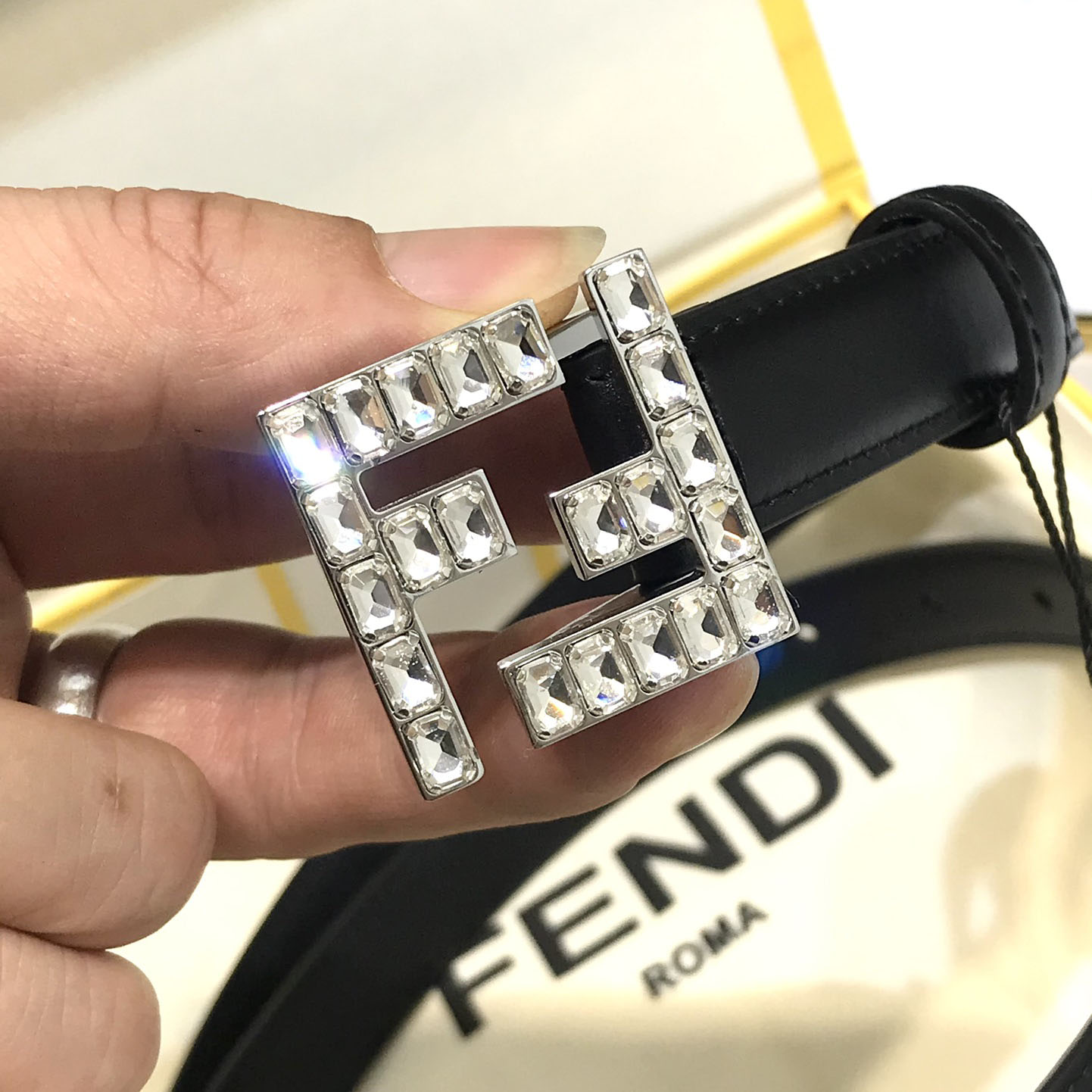 Fendi Women's FF Buckle With Crystal Belt In Black Calfskin With Silver Hardware 20mm