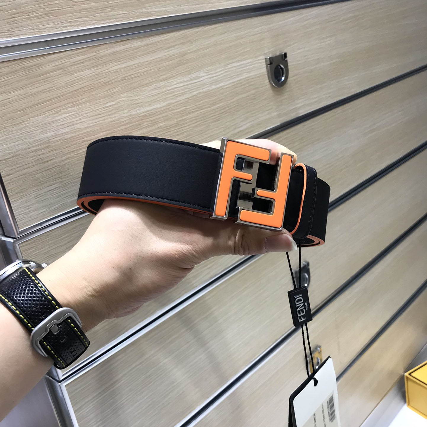 Fendi Women's FF Buckle Belt In Black/Khaki/Orange Calfskin With Gold/Black Hardware 60mm
