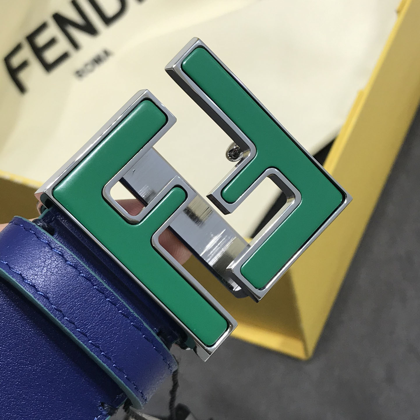 Fendi Men's Square FF Buckle Belt In Black/Blue Calfskin With Silver Hardware 40mm