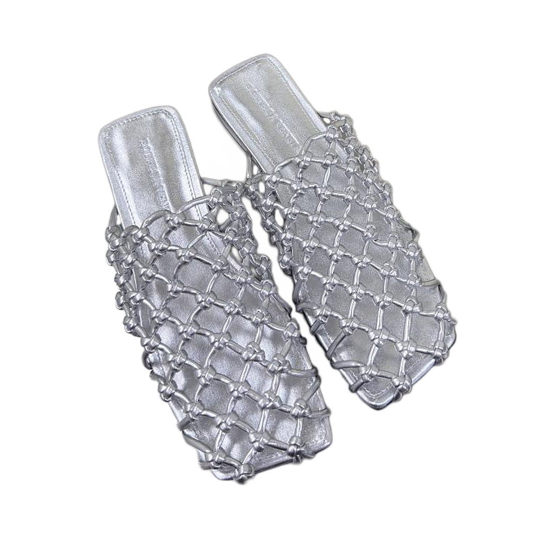 Bottega Veneta Riva Flat Mule In Silver Woven Hand-Knotted Leather Mule Pump