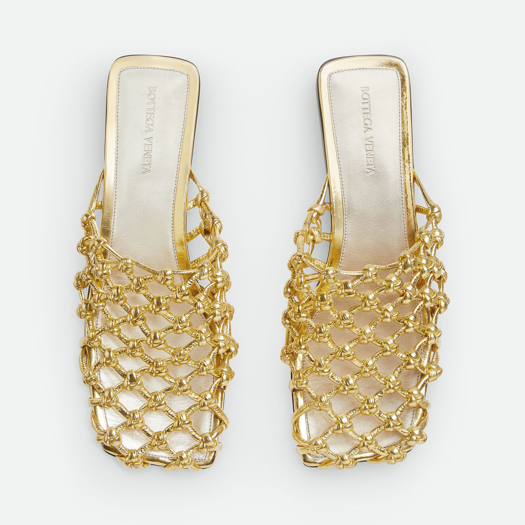 Bottega Veneta Riva Flat Mule In Gold Woven Hand-Knotted Leather Mule Pump