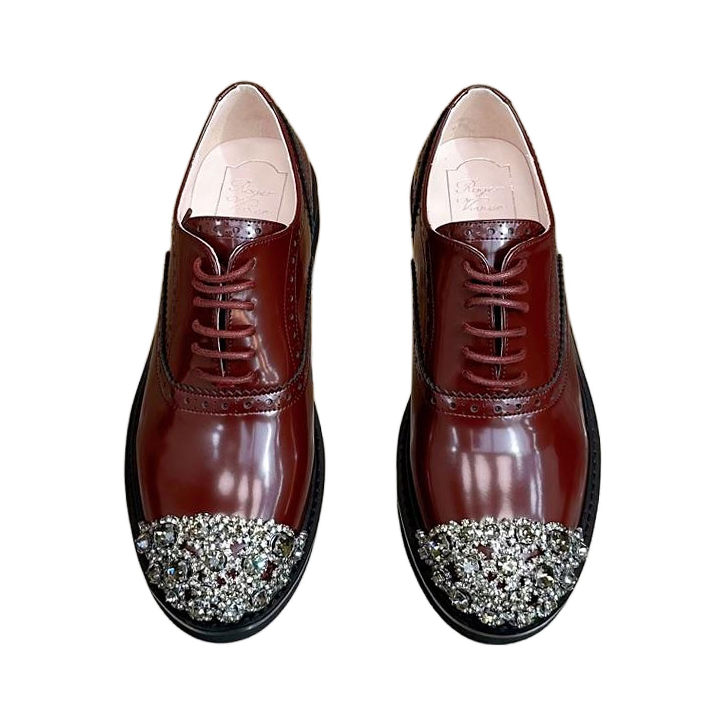 Roger Vivier Viv' Rangers Lace-Ups Loafers In White/Red Leather With Crystal Flowers