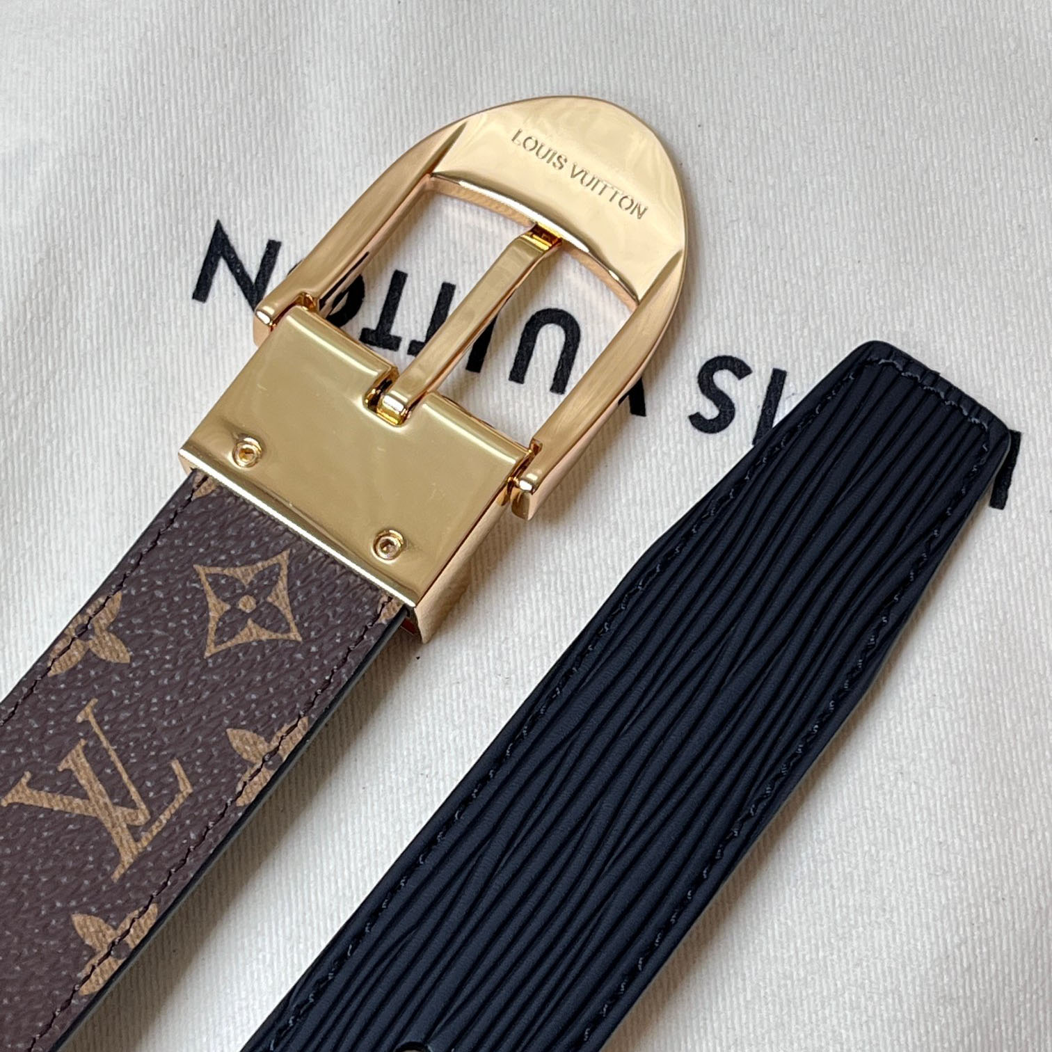 Louis Vuitton Women's Oversized Hook Reversible Belt In Black/Tan Calfskin And Monogram Canvas With Gold Hardware 40mm
