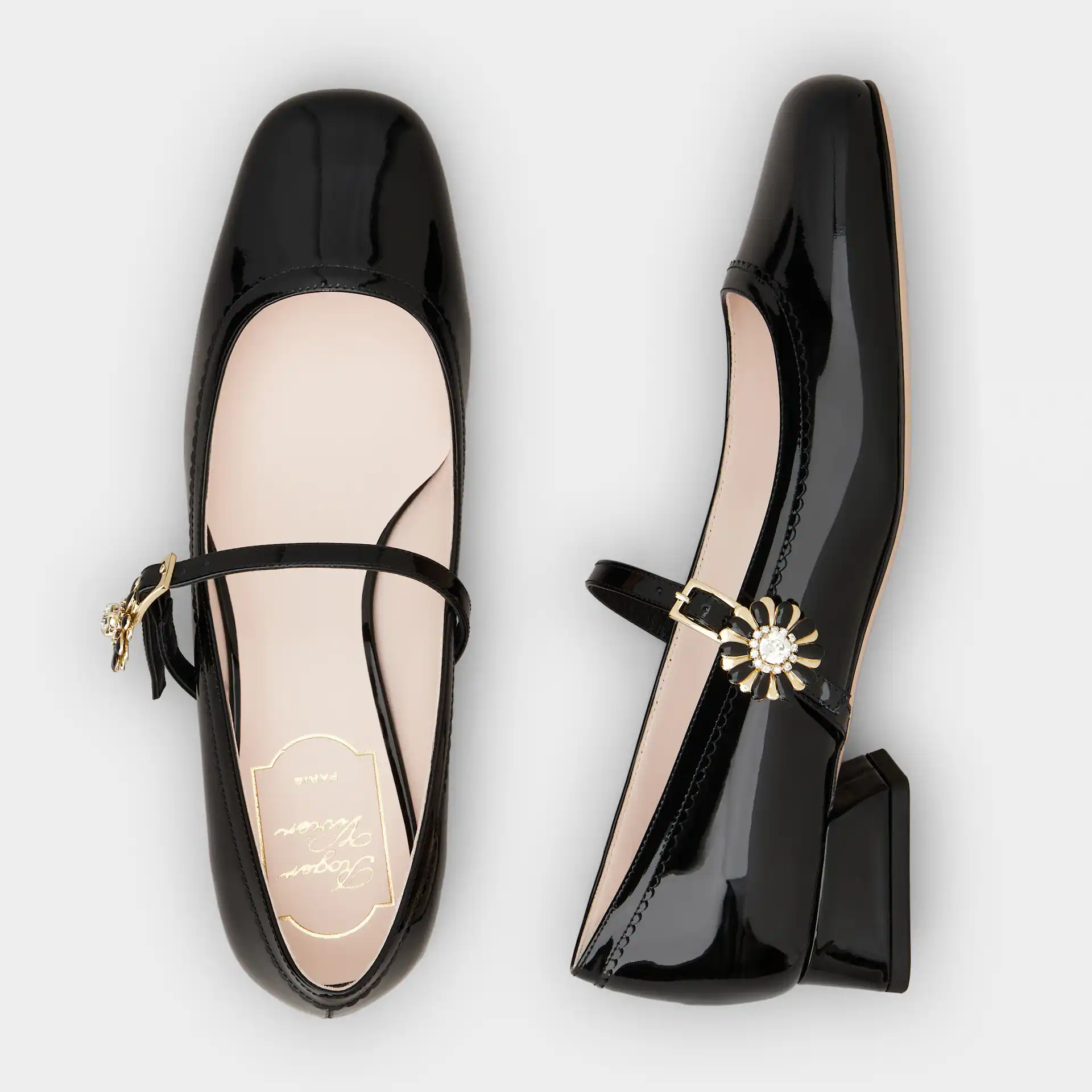 Roger Vivier Très Vivier Dasiy Mary Janes In Black Patent Leather With Flower Metal Buckle (Heel Height 2.5cm)