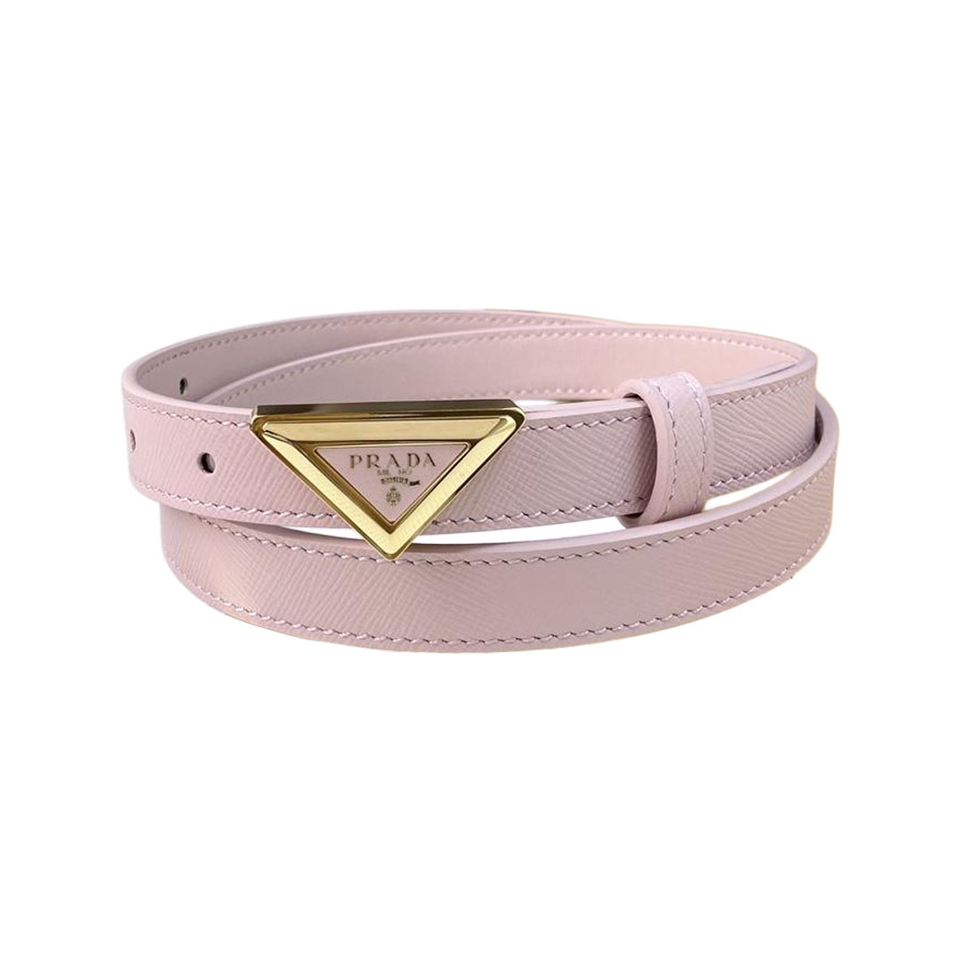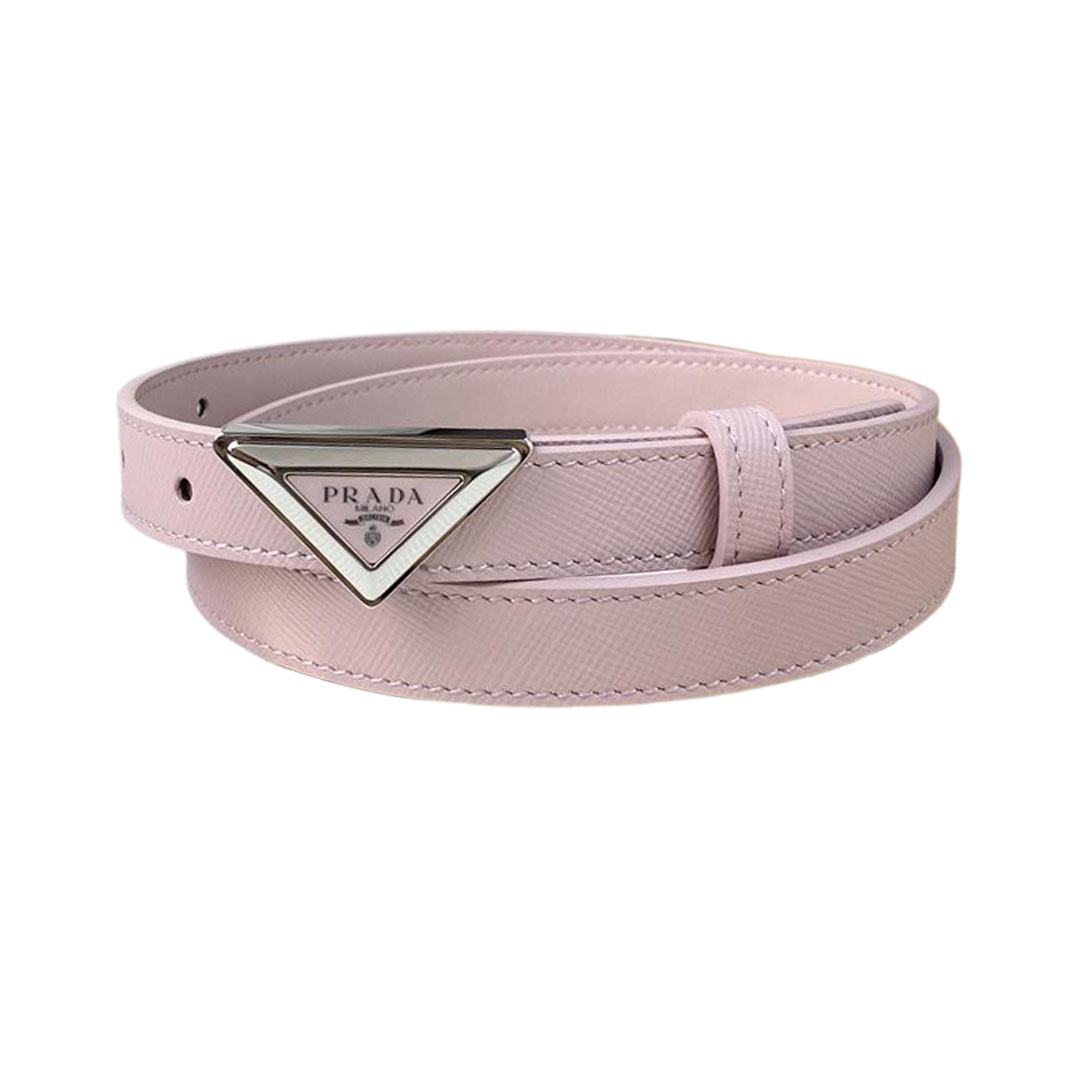 Prada Women' s Triangled Buckle Belt In Brown/Pink/White Calfskin With Gold/Silver Hardware 20mm