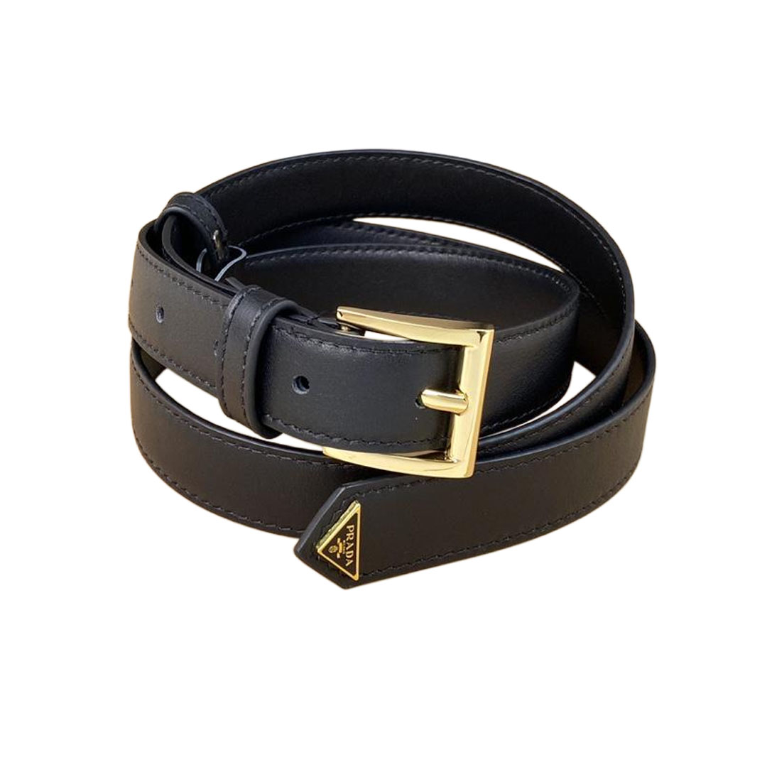 Prada Women' s Triangled Buckle Belt In Black Calfskin With Gold/Silver Hardware 30mm