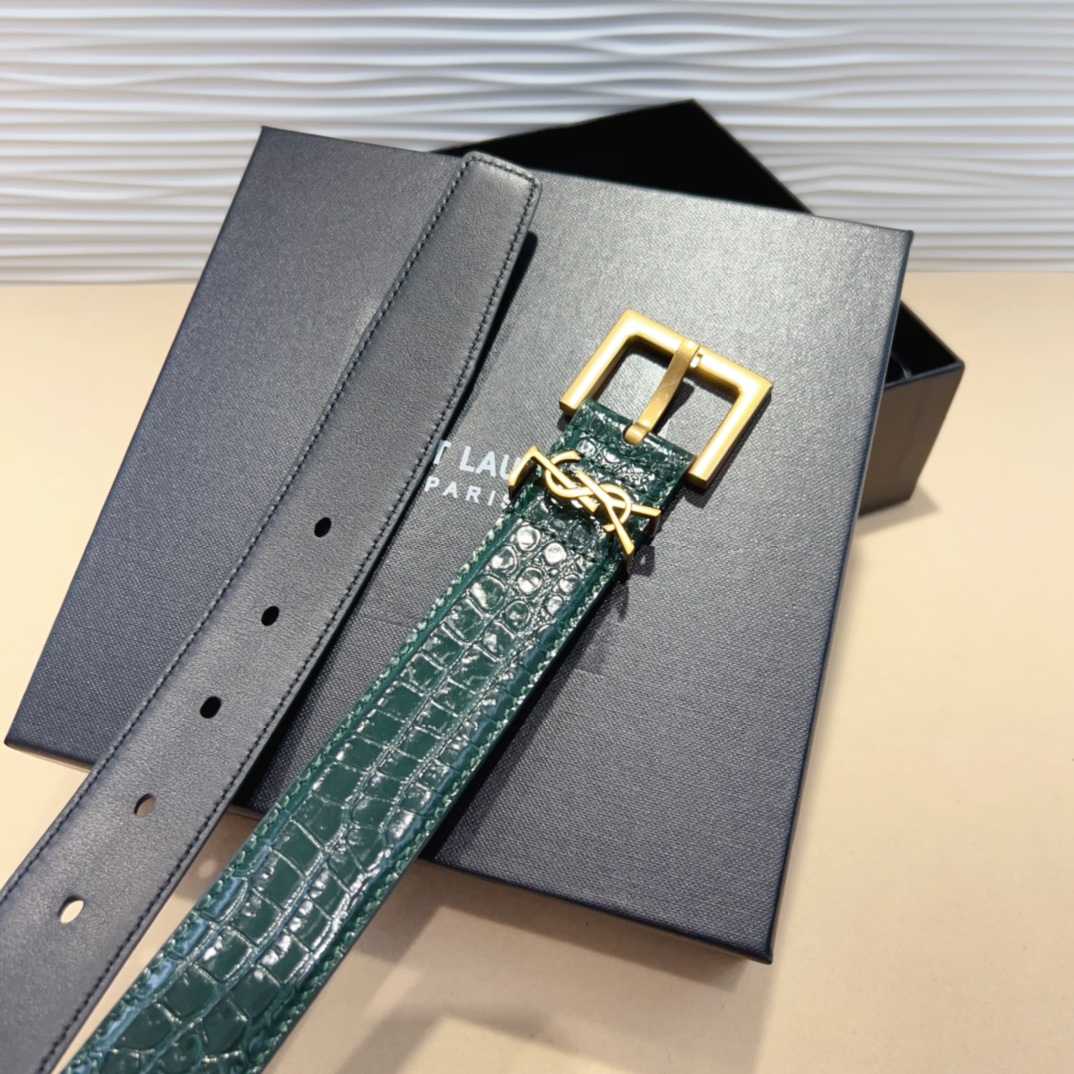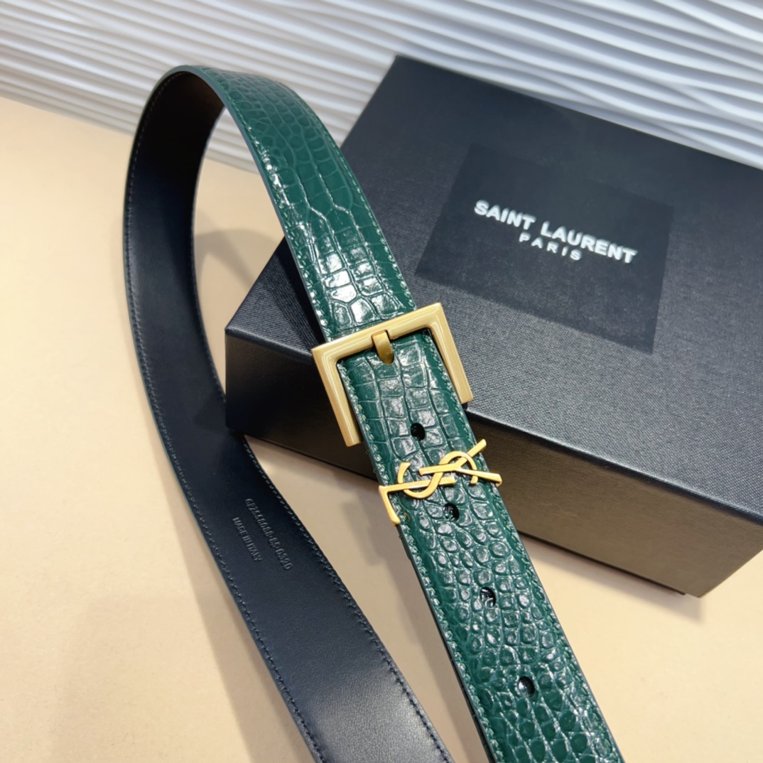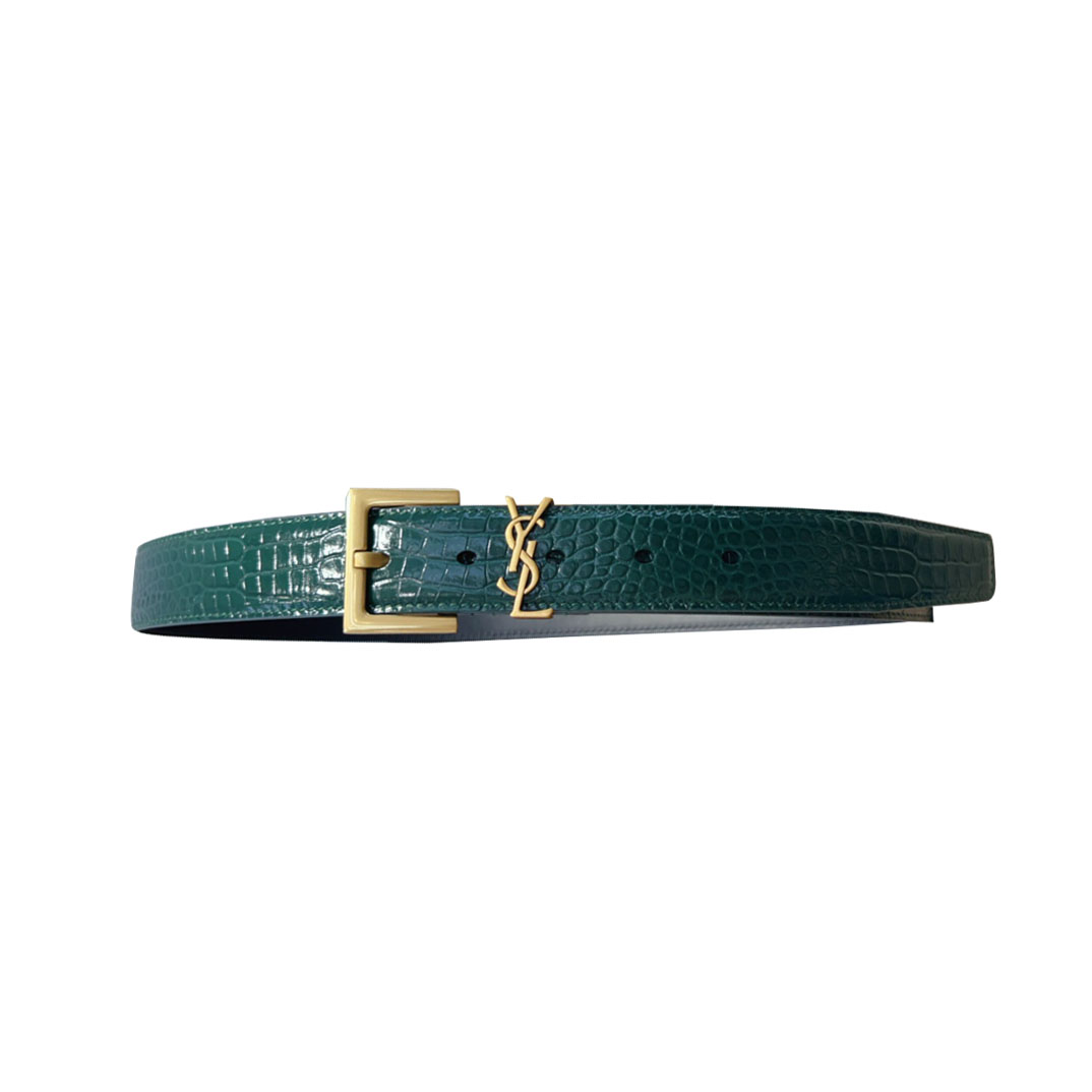 Saint Laurent Cassandre Belt In Black/Beige/Green Crocodile-Embossed Leather With Gold Hardware 30mm