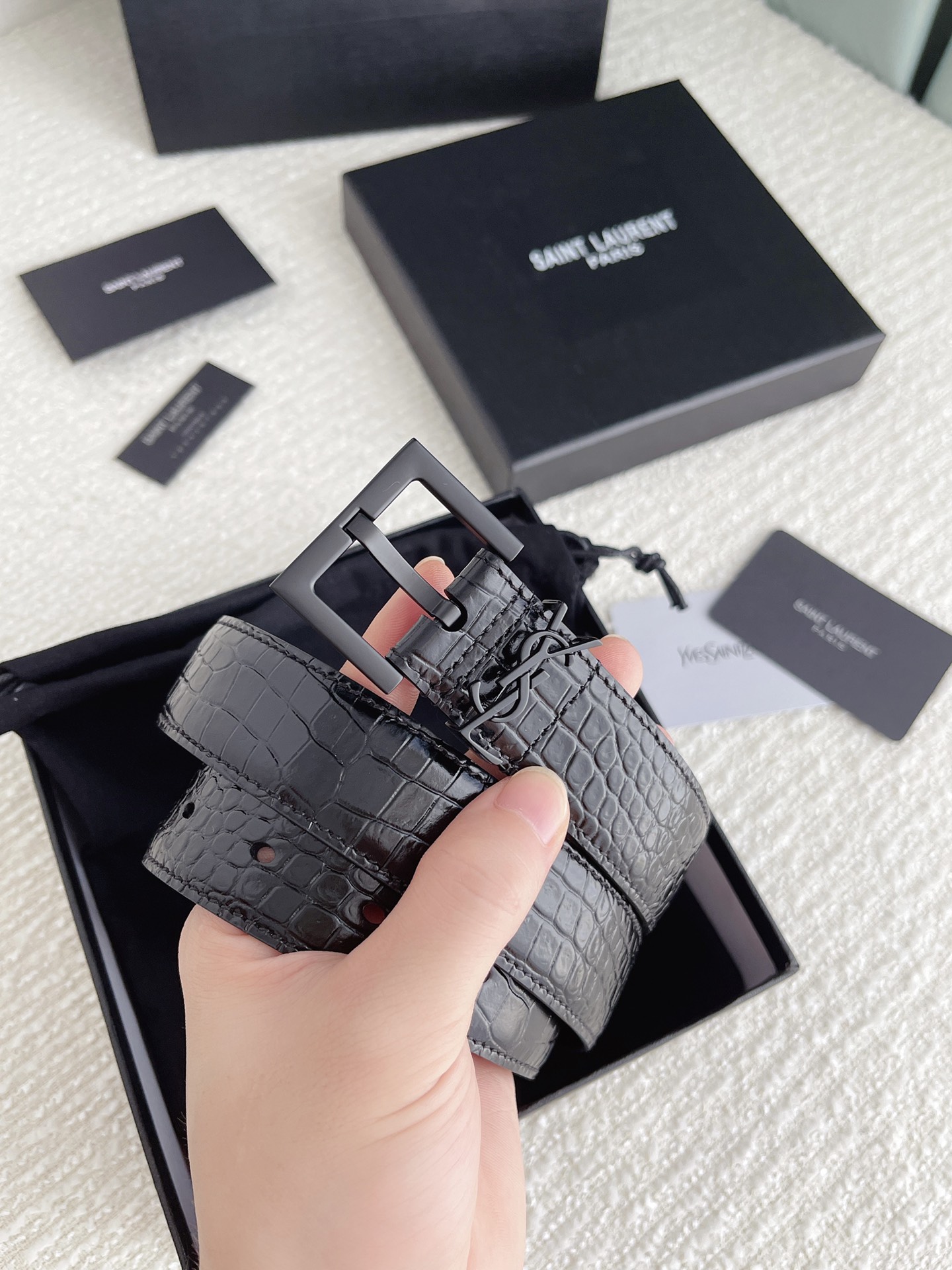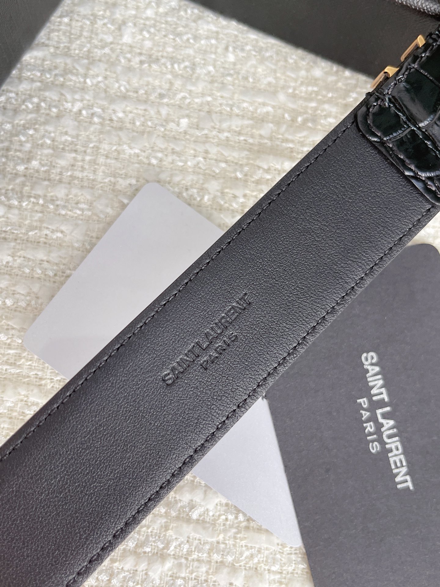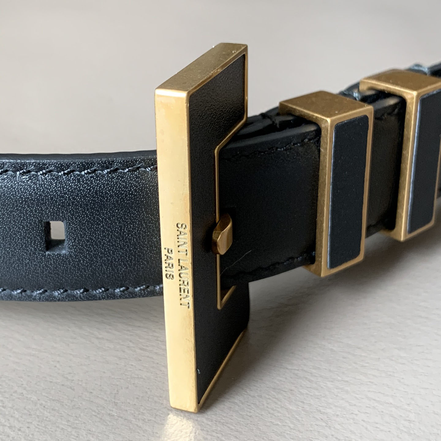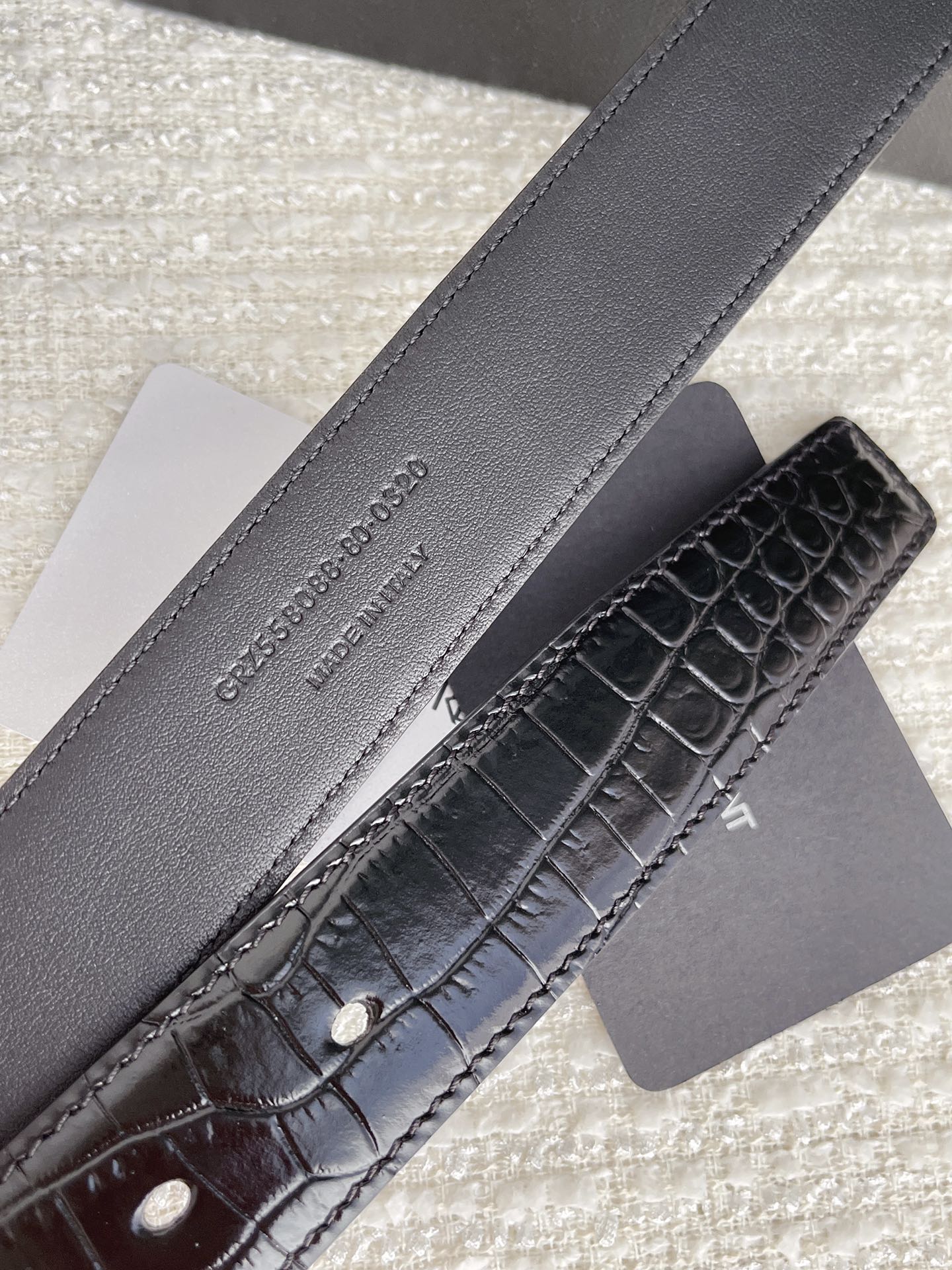 Saint Laurent Cassandre Belt In Black Crocodile-Embossed Calfskin With Gold/Silver/Black Hardware 30mm