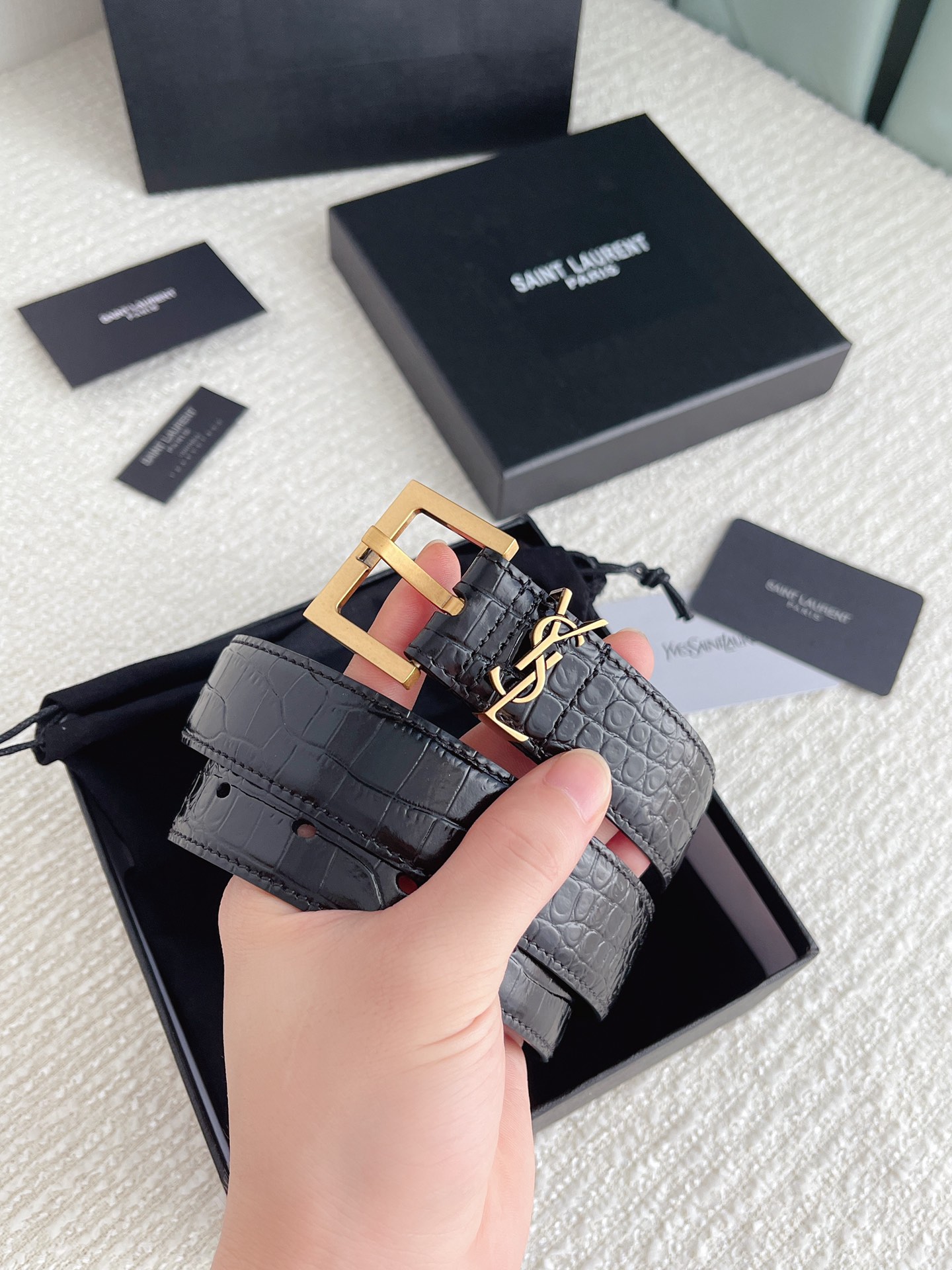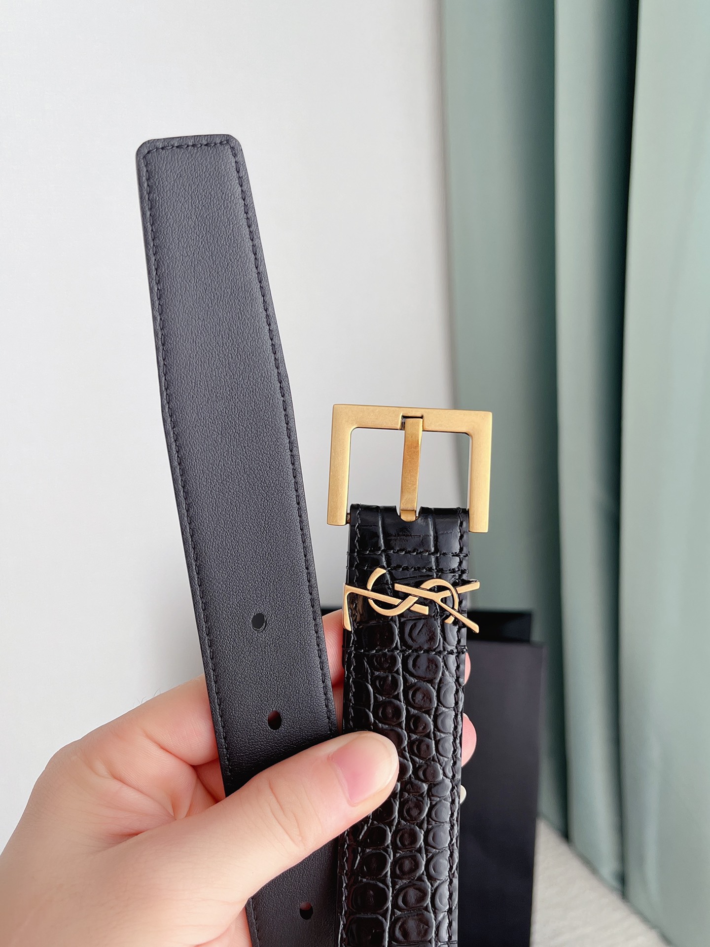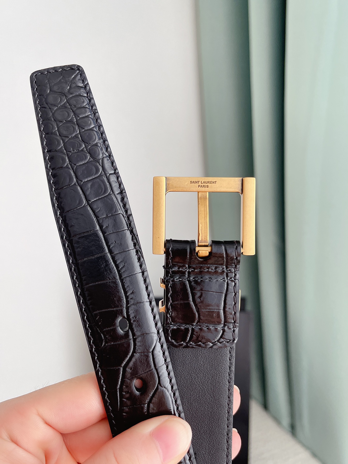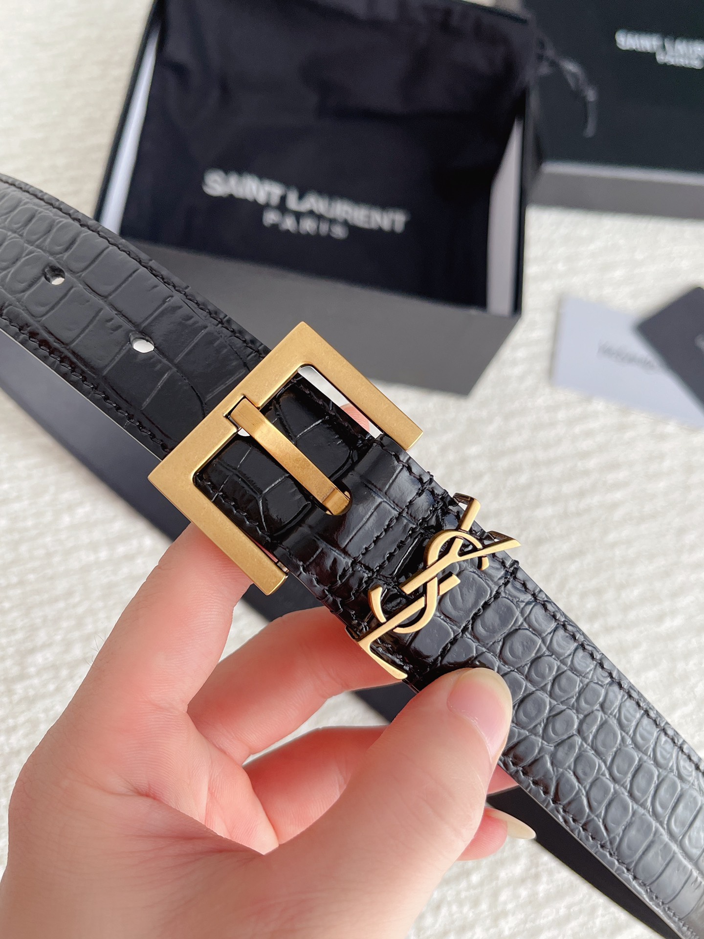 Saint Laurent Cassandre Belt In Black Crocodile-Embossed Calfskin With Gold/Silver/Black Hardware 30mm
