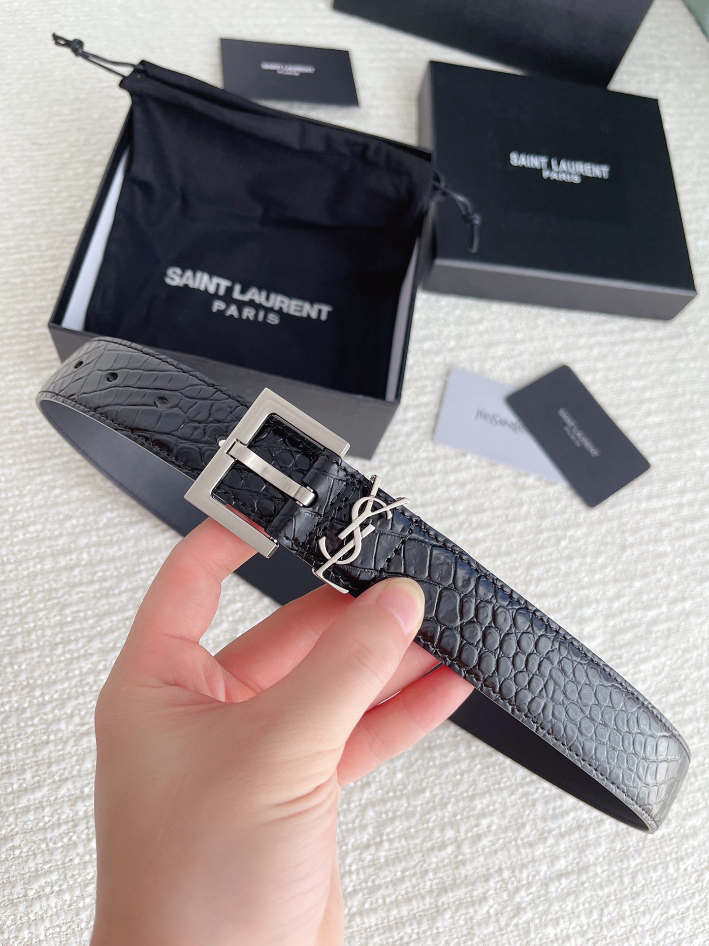 Saint Laurent Cintura Logo Buckle Belt In Black Crocodile-Embossed With Silver/Gold Hardware 30mm