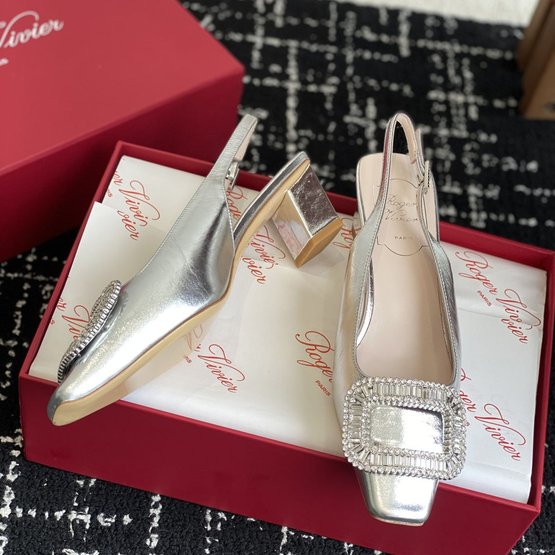 Roger Vivier Belle Viver Slingback Pumps High Heels In Silver Calfskin Leather With Crystal Buckle (Heel Height 4.5cm)